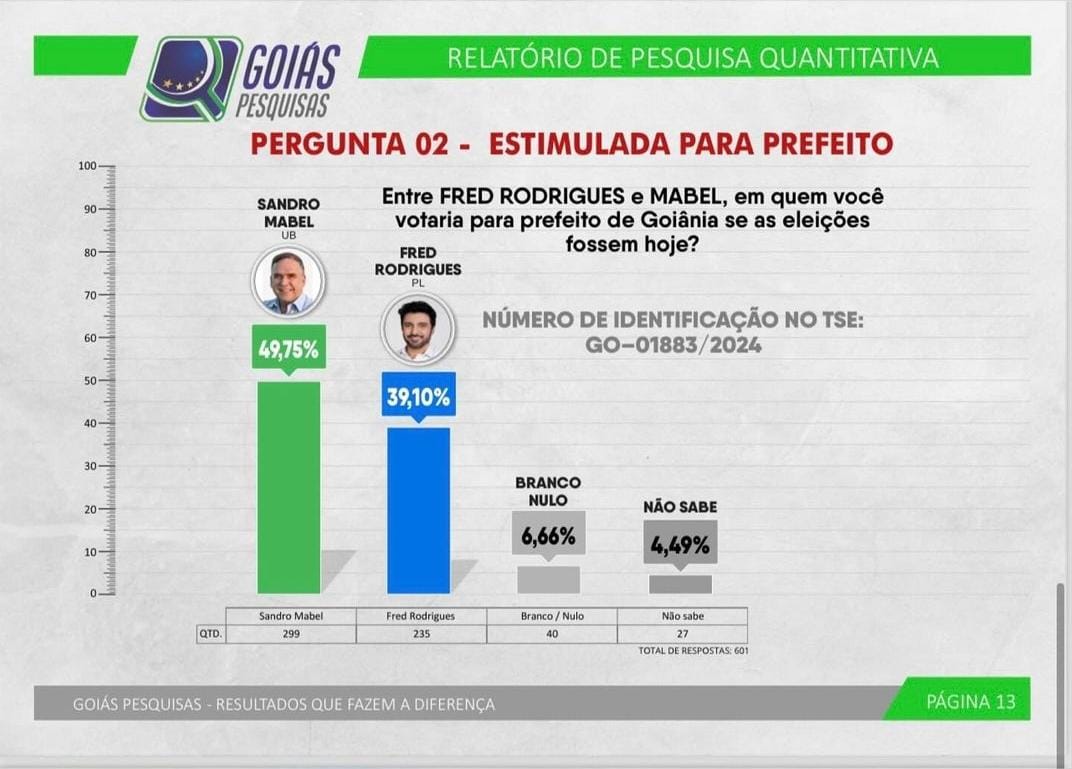 De acordo com o Opção Pesquisas, instituto vinculado ao Jornal Opção, Mabel chega a reta final da campanha com 57,1% dos votos válidos contra 42,9% de Fred Rodrigues (PL). A vantagem do candidato do União Brasil é de 13,2 pontos percentuais. A margem de erro é de 3,1 pontos percentuais para mais ou para menos.